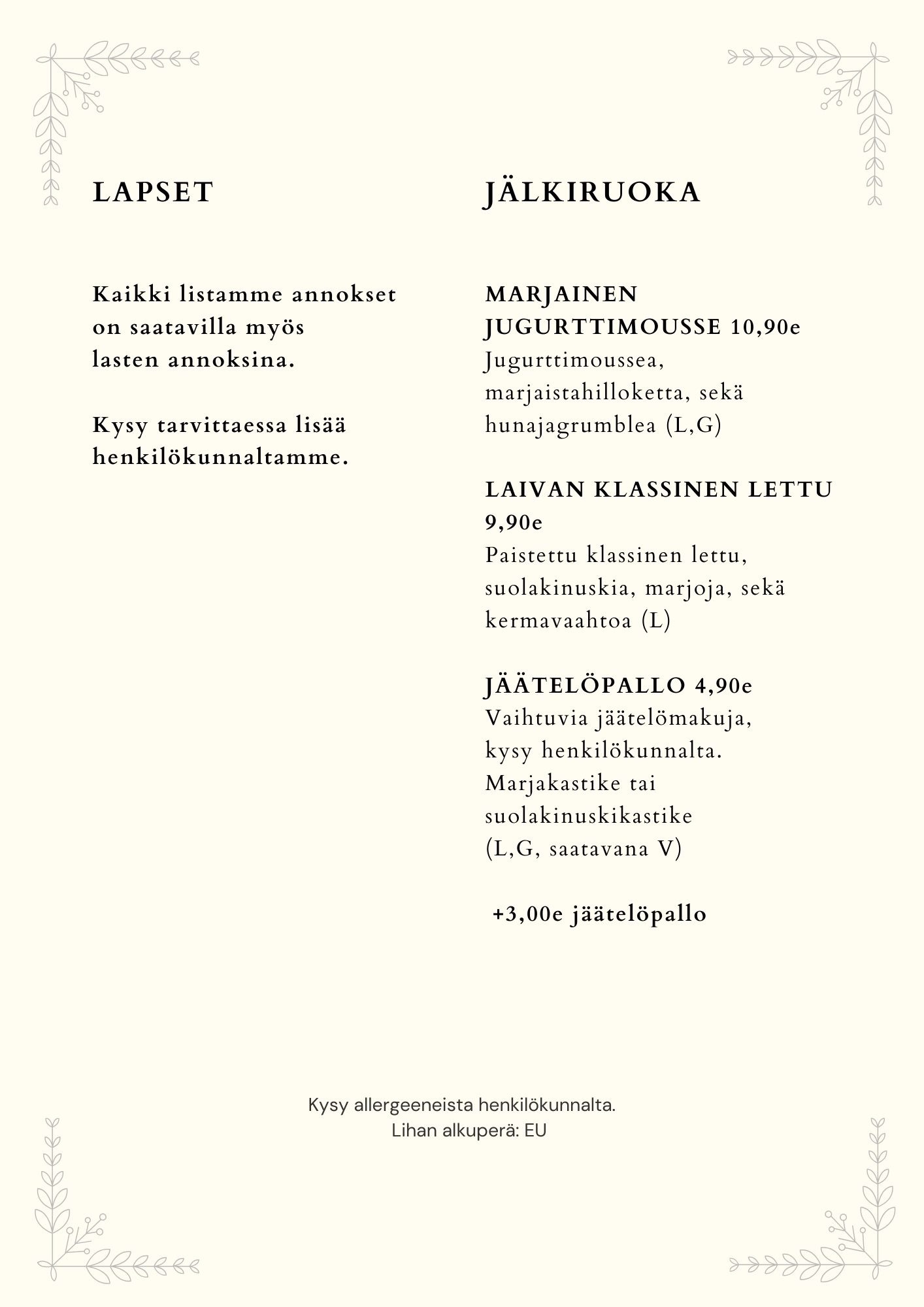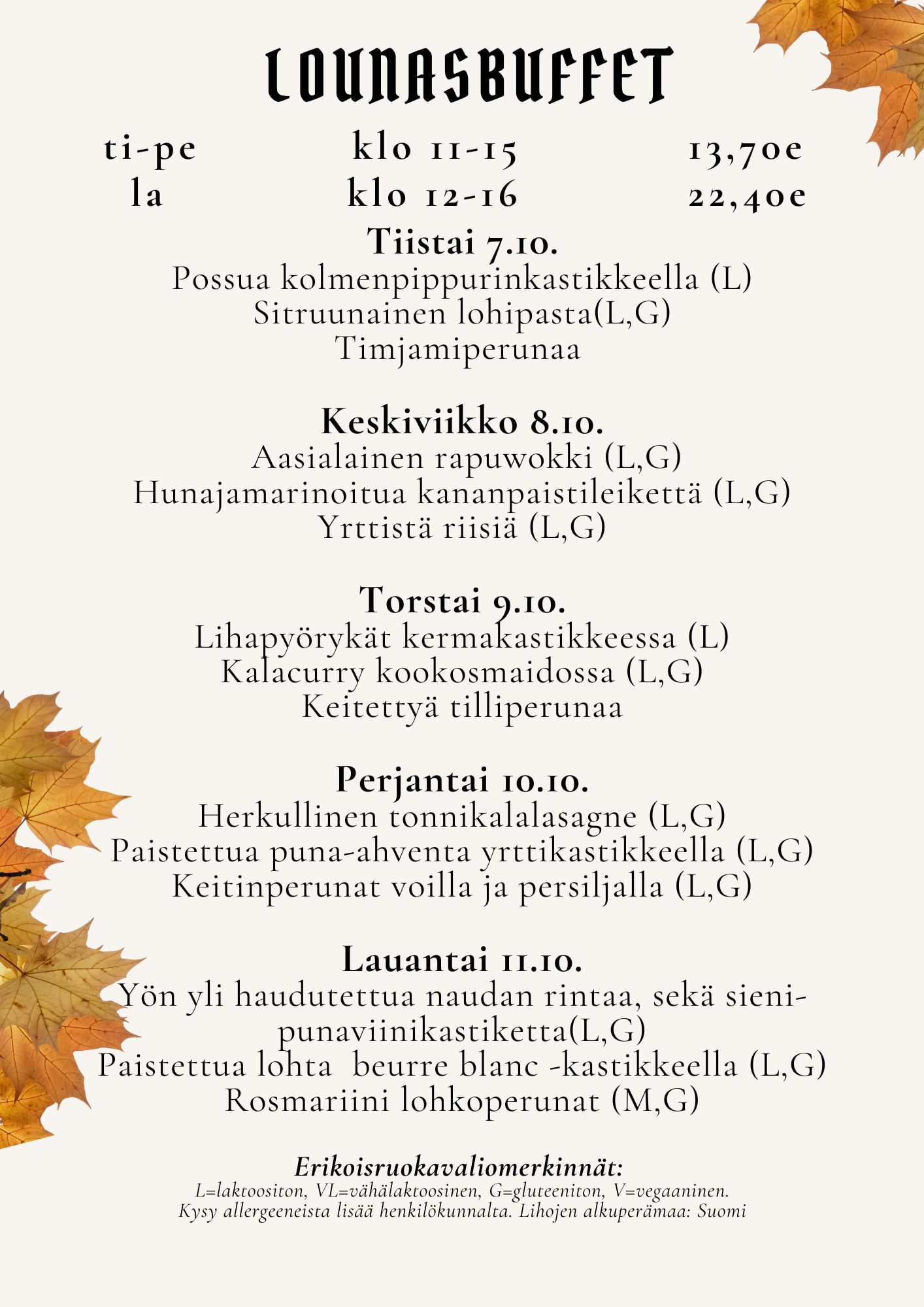 Lounaan hintaan sisältyy runsas alkupalapöytä, leipä ja levite sekä kahvi ja jälkiruoka.