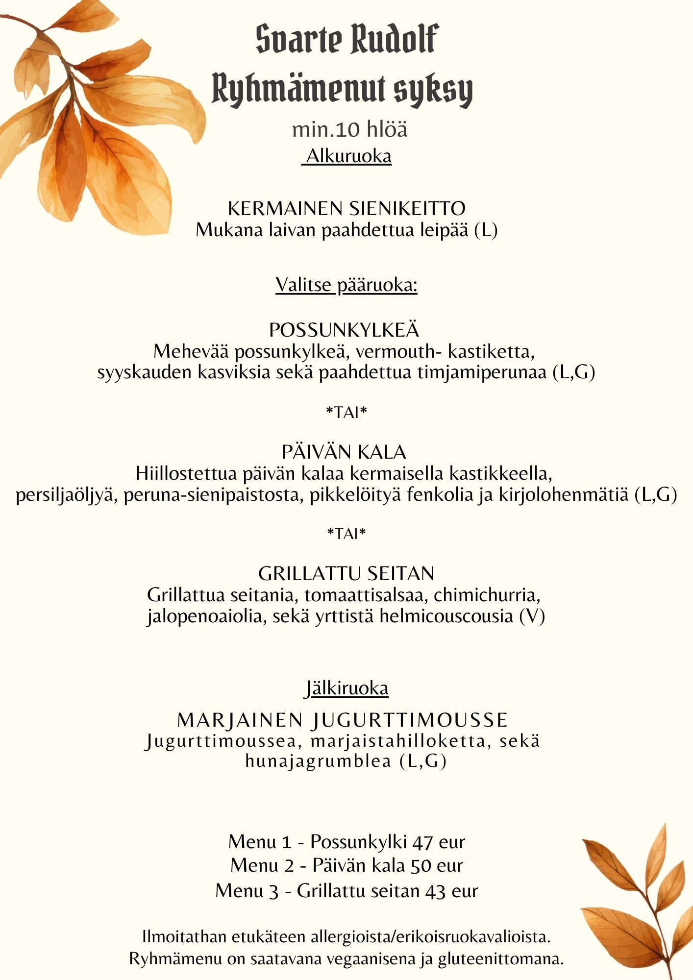 Svarte Rudolf on ympärivuotisesti toimiva tasokas ruokaravintola, joka on myös onnistuneiden juhlien ja kokousten pitopaikka. Kansainvälinen tunnelma, entisajan laivaromantiikkaa henkivät salongit ja messit jokinäköaloineen sekä hyvän ruoan mainetta niittänyt laivan keittiö ovatkin tehneet Svarte Rudolfista erään Suomen suosituimmista laivaravintoloista. Nykyään Svarte Rudolf tunnetaan myös maamme rajojen ulkopuolella. Toivotamme sinut sydämellisesti nauttimaan hyvästä ruoasta ja juomasta Turun tunnelmallisimmassa ympäristössä.